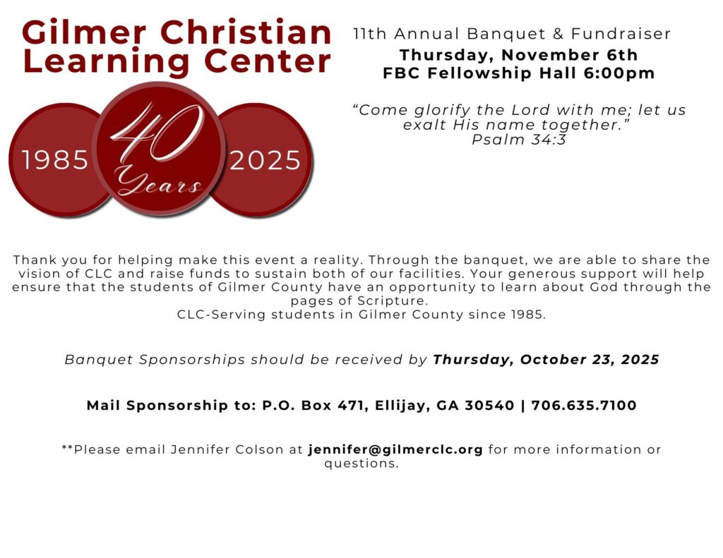 2025 Online Banquet Sponsorship Form Please enable JavaScript in your browser to complete this form.Sponsorship Name: (As you would like it to appear when recognized) *Sponsorship Address *Address Line 1Address Line 2City— Select state —AlabamaAlaskaArizonaArkansasCaliforniaColoradoConnecticutDelawareDistrict of ColumbiaFloridaGeorgiaHawaiiIdahoIllinoisIndianaIowaKansasKentuckyLouisianaMaineMarylandMassachusettsMichiganMinnesotaMississippiMissouriMontanaNebraskaNevadaNew HampshireNew JerseyNew MexicoNew YorkNorth CarolinaNorth DakotaOhioOklahomaOregonPennsylvaniaRhode IslandSouth CarolinaSouth DakotaTennesseeTexasUtahVermontVirginiaWashingtonWest VirginiaWisconsinWyomingStateZip CodeSponsor Contact Person: *FirstLastSponsor Phone Number: *Sponsor Email *Sponsor Level *Elite-$10,000 or aboveDiamond-$5,000Platinum-$2,500Gold-$1,000Silver-$500Bronze-$250Angel-Your choiceFor each level’s perks, please refer to the section above.Contribution Amount: *How would you like to make your contribution? *CheckCashDebit/Credit/PayPalPlease make all checks out to Gilmer CLC | P.O. Box 471| Ellijay, GA 30540. Would you like to RSVP to the CLC Banquet? *YesNoNumber Attending: *Total Amount of Contribution$0.00Submit Sponsorship Form