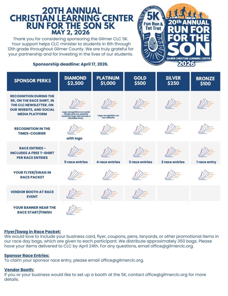 The CLC is a 501(c)3 Non-Profit organization. Most contributions to this event are tax-deductible as marketing & advertising (consult with your tax advisor). Please visit www.gilmerclc.org/5k for race details or to sign up for the 5K. For sponsorship questions email jennifer@gilmerclc.org or call 706-635-7100. Please make checks payable to Gilmer Christian Learning Center with the memo stating “5K sponsor” P.O. Box 471 | Ellijay, GA 30540.