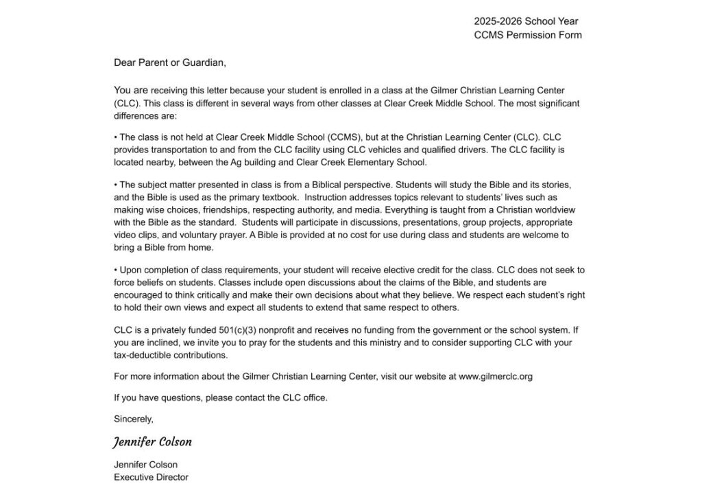 25-26 Middle School Permission Form Please enable JavaScript in your browser to complete this form.Parent/Guardian Permission & Liability Form-2025-2026 School Year Student Information Student Name *FirstLastSchool: Clear Creek Middle School (CCMS) Grade: *— Select Choice —6th7th8thParent/Guardian Name: *FirstLastParent/Guardian Phone: *Parent/Guardian Email: *Program Information (Released Time Education) The Gilmer Christian Learning Center (CLC) is a privately funded 501(c)(3) nonprofit Released Time Education ministry. Participation is voluntary and chosen by the student with parent/guardian permission. CLC receives no funding from the government or the school system. CLC classes are not held on school property; instruction occurs on CLC property during the school day. Permissions (Please Check) I give permission for my student to participate in the CLC program *YESNOI give permission for my student to be transported by vehicles to and from school to the CLC facility. *YESNOI give permission for my student to access the Internet during class time at CLC (for instructional purposes). *YESNOI give permission for my student to be photographed and/or videotaped during CLC activities (for use in publication or ministry communications). *YESNOStudent Converstaions Disclaimer: CLC staff may be approached by students to discuss personal or spiritual matters. CLC staff are not trained or licensed counselors. Understanding this, I give permission for my student to voluntarily discuss personal matters with CLC staff. *YESNOTechnology Notice: CLC may use Google Classroom and Google Meet for instruction. Google Meet sessions may be recorded and retained for CLC accesss only for the safety and protection of students, staff, and the ministry. I acknowledge and consent to the Technology Notice above *YESNOField Trips & Service Projects I give permission for my student to participate in short supervised activities during the scheduled CLC class period, which may inlcude: wallking, or being transported for the CLC campus to a local service project. I understand students will return in time for their next scheduled class. I give permission for short field trips/service projects during the CLC class period. *YESNOAssumption of Risk & Liability Acknowledgment I acknowledge that participation in the CLC program involves risk and may result in injury or illness, including possible exposure to infectious or communicable diseases (including but not limited to COVID-19). I voluntarily assume these risks on behalf of my student and agree to release and hold harmless the Gilmer Christian Learning Center (CLC), its staff, board members, volunteers, and affiliates to the fullest extent permitted by law. Parent/Guardian Initials *Enrollment Permission Period Students may take CLC for one or more quarters. Please select ONE option below: *Full School Year Permission (2025-2026): I give permission for my student to participate in CLC any quarter this school year, as scheduled/availableQuarter-by- Quarter Permission Only:Quarter 1 Clear Signature Quarter 2 Clear Signature Quarter 3 Clear Signature Quarter 4 Clear Signature Emergency / Medical Information Please list any allergies, medical needs, or other concerns. Emergency Contact Name: *FirstLastEmergency Contact Phone: *Relationship *Signatures Parent/Guardian Signature * Clear Signature Date *Student Signature (voluntary participation): * Clear Signature Date *PhoneSubmit CCMS Permission Form